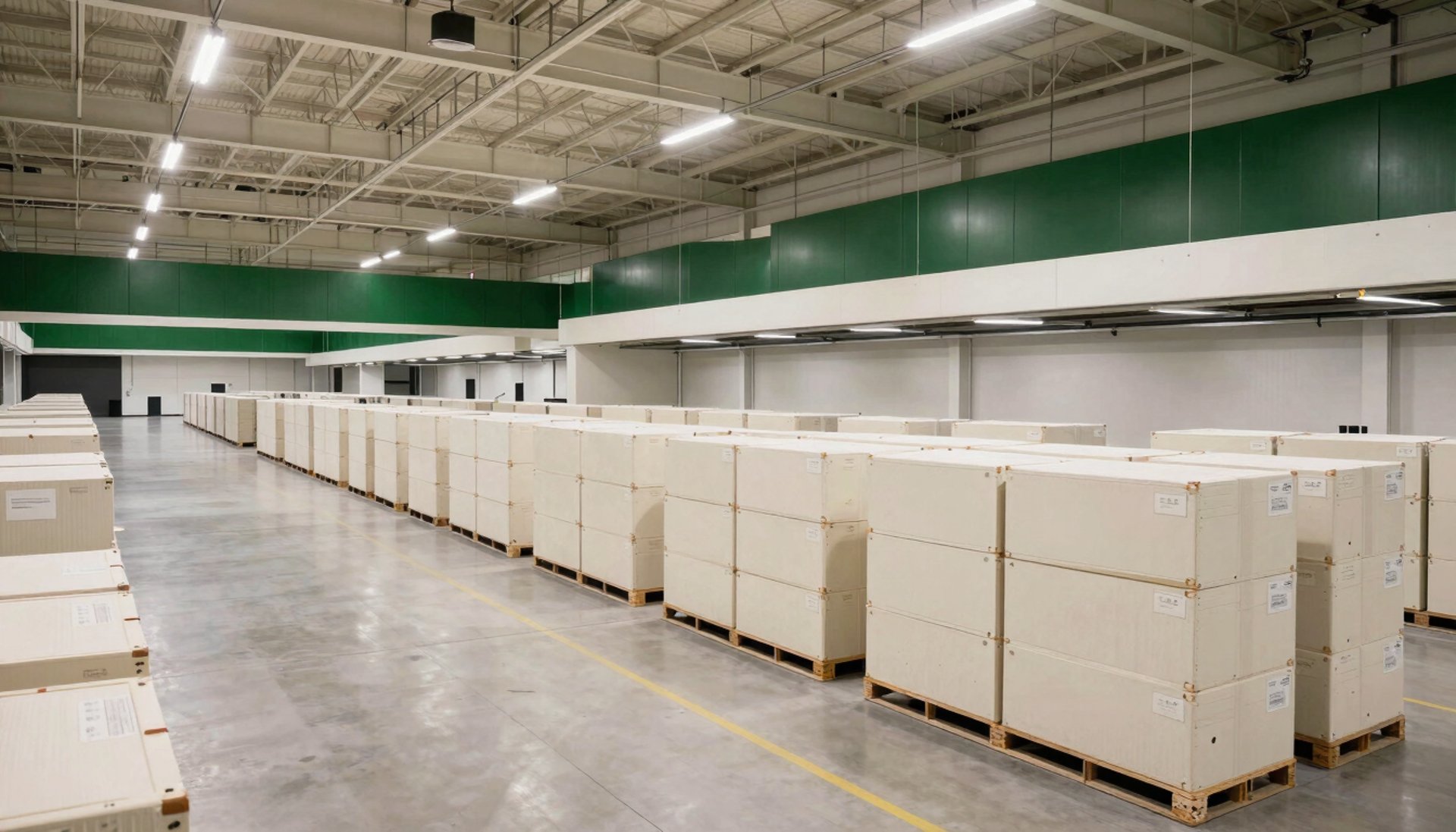 A wide-angle photography shot of a perfectly clean and organized North American distribution center with high ceilings and polished concrete floors, bathed in bright, natural light from skylights.
